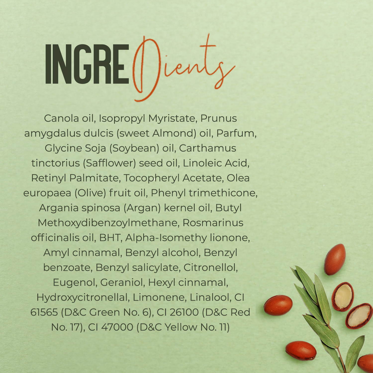 View All IngredientsCanola oil, Isopropyl Myristate, Prunus amygdalus dulcis (sweet Almond) oil, Parfum, Glycine Soja (Soybean) oil, Carthamus tinctorius (Safflower) seed oil, Linoleic Acid, Retinyl Palmitate, Tocopheryl Acetate, Olea europaea (Olive) fruit oil, Phenyl trimethicone, Argania spinosa (Argan) kernel oil, Butyl Methoxydibenzoylmethane, Rosmarinus officinalis oil, BHT, Alpha-Isomethylionone, Amyl cinnamal, Benzyl alcohol, Benzyl benzoate, Benzyl salicylate, Citronellol, Eugenol, Geraniol, Hexyl cinnamal, Hydroxycitronellal, Limonene, Linalool, CI 61565 (D&C Green No. 6), CI 26100(D&C Red No. 17), CI 47000(D&C Yellow No. 11)