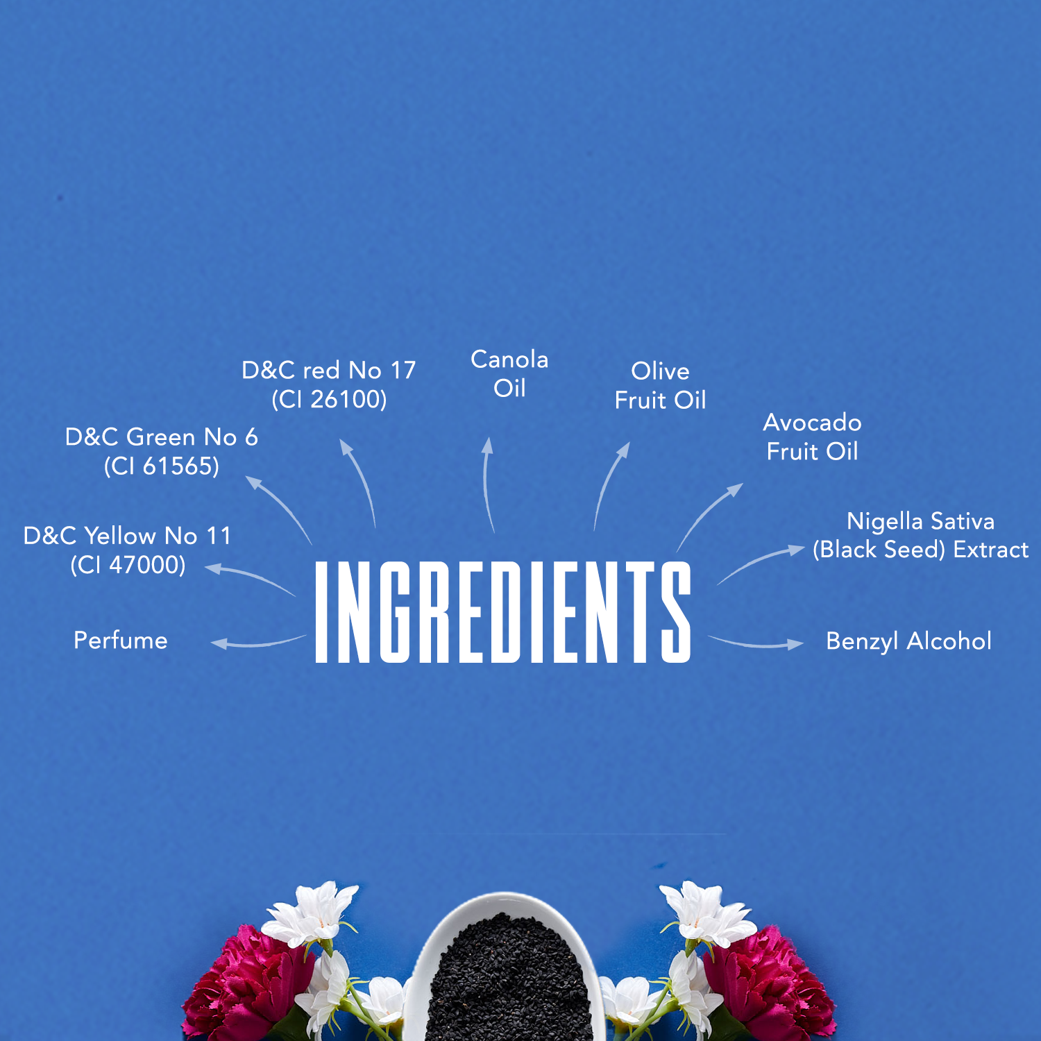 View All IngredientsCanola oil, Isopropyl Myristate, Prunus amygdalus dulcis (sweet Almond) oil, Parfum, Glycine Soja (Soybean) oil, Carthamus tinctorius (Safflower) seed oil, Linoleic Acid, Retinyl Palmitate, Tocopheryl Acetate, Nigella sativa (Blackseed) seed extract, Rubus fruticosus (Blackberry) extract, Helianthus annuus seed oil, Rosmarinus officinalis leaf extract, Persea gratissima (Avocado) oil, Phyllanthus emblica (Amla) fruit extract, Lawsonia inermis (Henna) leaf extract, Olea europaea (Olive) fruit oil, Elaeis guineensis oil, Phenyl trimethicone, Butyl Methoxydibenzoylmethane, Rosmarinus officinalis oil, BHT, Alpha-isomethyl ionone, Benzyl Alochol, Citral, Citronellol, Geraniol, Hexyl cinnamal, Limonene, Linalool, CI 61565 (D&C Green No. 6), CI 26100 (D&C Red No. 17), CI 47000 (D&C Yellow No. 11)