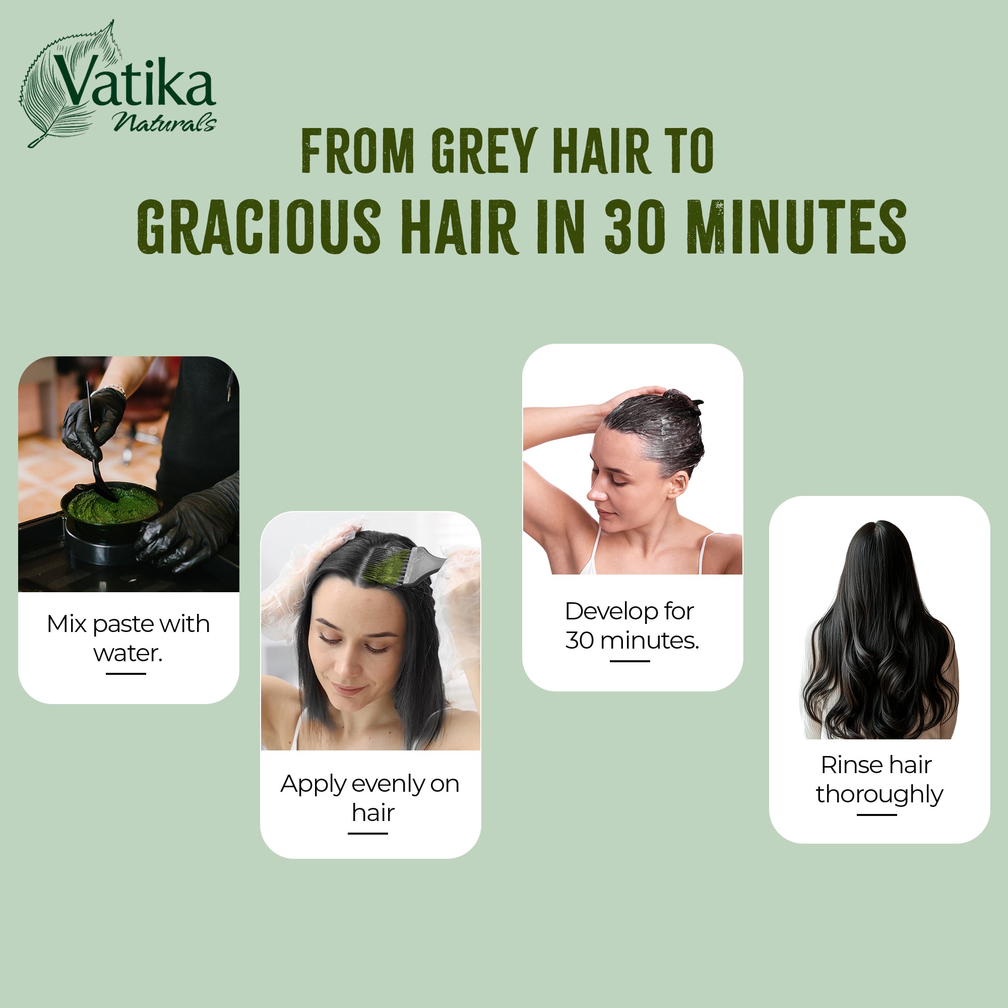 Empty one sachet of Vatika Henna Hair Colour into a bowl. Add 40ml of water and mix to form a uniform paste.Using an applicator brush, apply paste evenly, focus on white hair. Allow colour to develop for 30 minutes. Wash hair thoroughly with lukewarm water. FOR ENHANCED RESULTS - INCREASE FREQUENCY OF USAGE