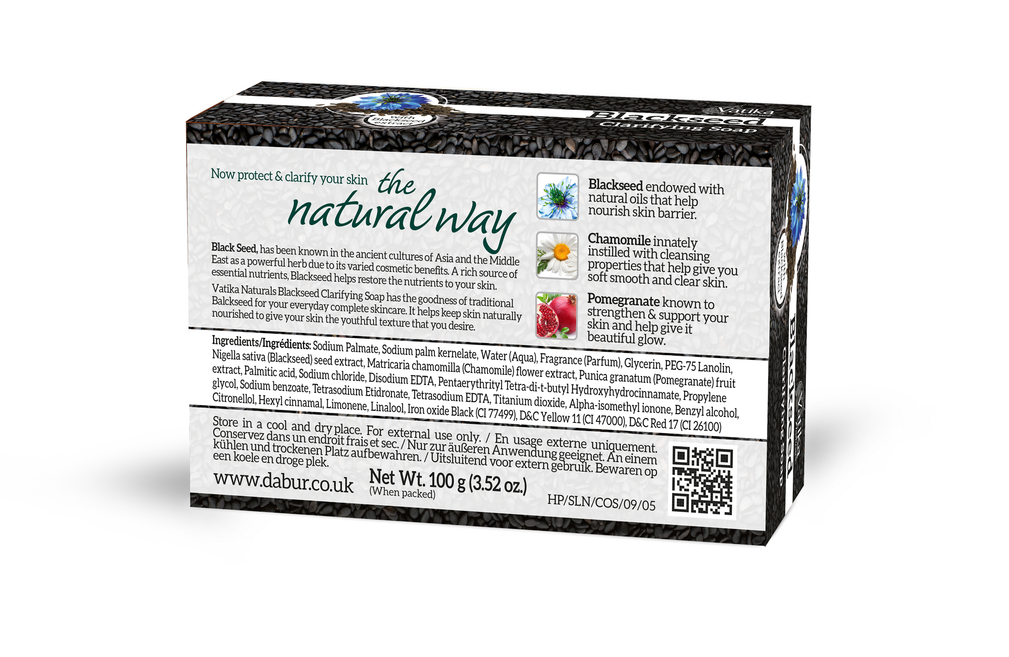 View All IngredientsSodium Palmate, Sodium palm kernelate, Water (Aqua), Fragrance (Parfum), Glycerin, PEG-75 Lanolin, Nigella sativa (Blackseed) seed extract, Matricaria chamomilla (Chamomile) flower extract, Punica granatum (Pomegranate) fruit extract, Palmitic acid, Sodium chloride, Disodium EDTA, Pentaerythrityl Tetra-di-t-butyl Hydroxyhydrocinnamate, Propylene glycol, Sodium benzoate, Tetrasodium Etidronate, Tetrasodium EDTA, Titanium dioxide, Alpha-isomethyl ionone, Benzyl alcohol, Citronellol, Hexyl cinnamal, Limonene, Linalool, Iron oxide Black (CI 77499), D&C Yellow 11 (CI 47000), D&C Red 17 (CI 26100)
