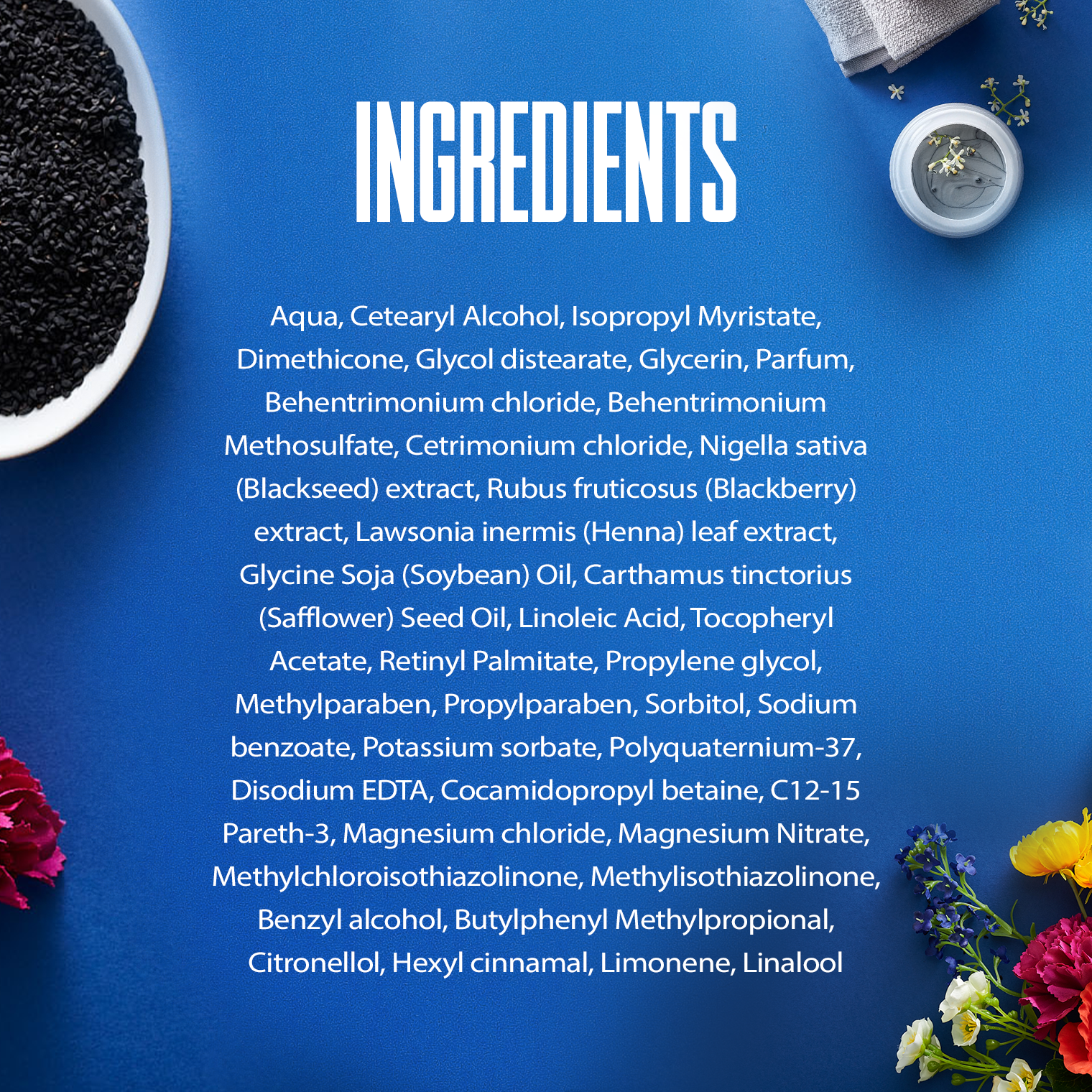 View All IngredientsAqua, Cetearyl Alcohol, Isopropyl Myristate, Dimethicone, Glycol distearate, Glycerin, Parfum, Behentrimonium chloride, Behentrimonium Methosulfate, Cetrimonium chloride, Nigella sativa (Blackseed) extract, Rubus fruticosus (Blackberry) extract, Lawsonia inermis (Henna) leaf extract, Glycine Soja (Soybean) Oil, Carthamus tinctorius (Safflower) Seed Oil, Linoleic Acid, Tocopheryl Acetate, Retinyl Palmitate, Propylene glycol, Methylparaben, Propylparaben, Sorbitol, Sodium benzoate, Potassium sorbate, Polyquaternium-37, Disodium EDTA, Cocamidopropyl betaine, C12-15 Pareth-3, Magnesium chloride, Magnesium Nitrate, Methylchloroisothiazolinone, Methylisothiazolinone, Benzyl alcohol, Butylphenyl Methylpropional, Citronellol, Hexyl cinnamal, Limonene, Linalool.