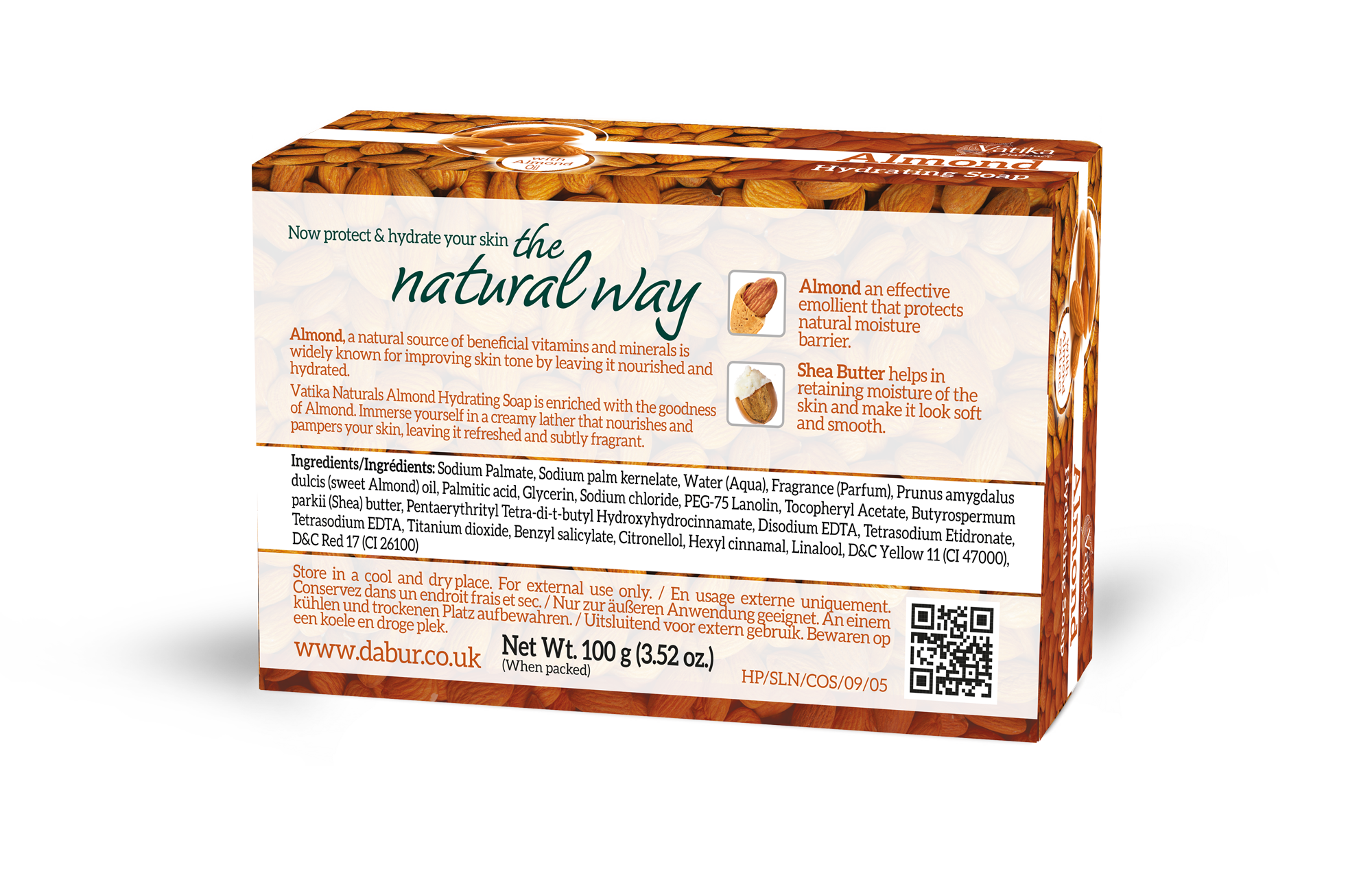 Sodium Palmate, Sodium palm kernelate, Water (Aqua), Fragrance (Parfum), Prunus amygdalus dulcis (sweet Almond) oil, Palmitic acid, Glycerin, Sodium chloride, PEG-75 Lanolin, Tocopheryl Acetate, Butyrospermum parkii (Shea) butter, Pentaerythrityl Tetra-di-t-butyl Hydroxyhydrocinnamate, Disodium EDTA, Tetrasodium Etidronate, Tetrasodium EDTA, Titanium dioxide, Benzyl salicylate, Citronellol, Hexyl cinnamal, Linalool, D&C Yellow 11