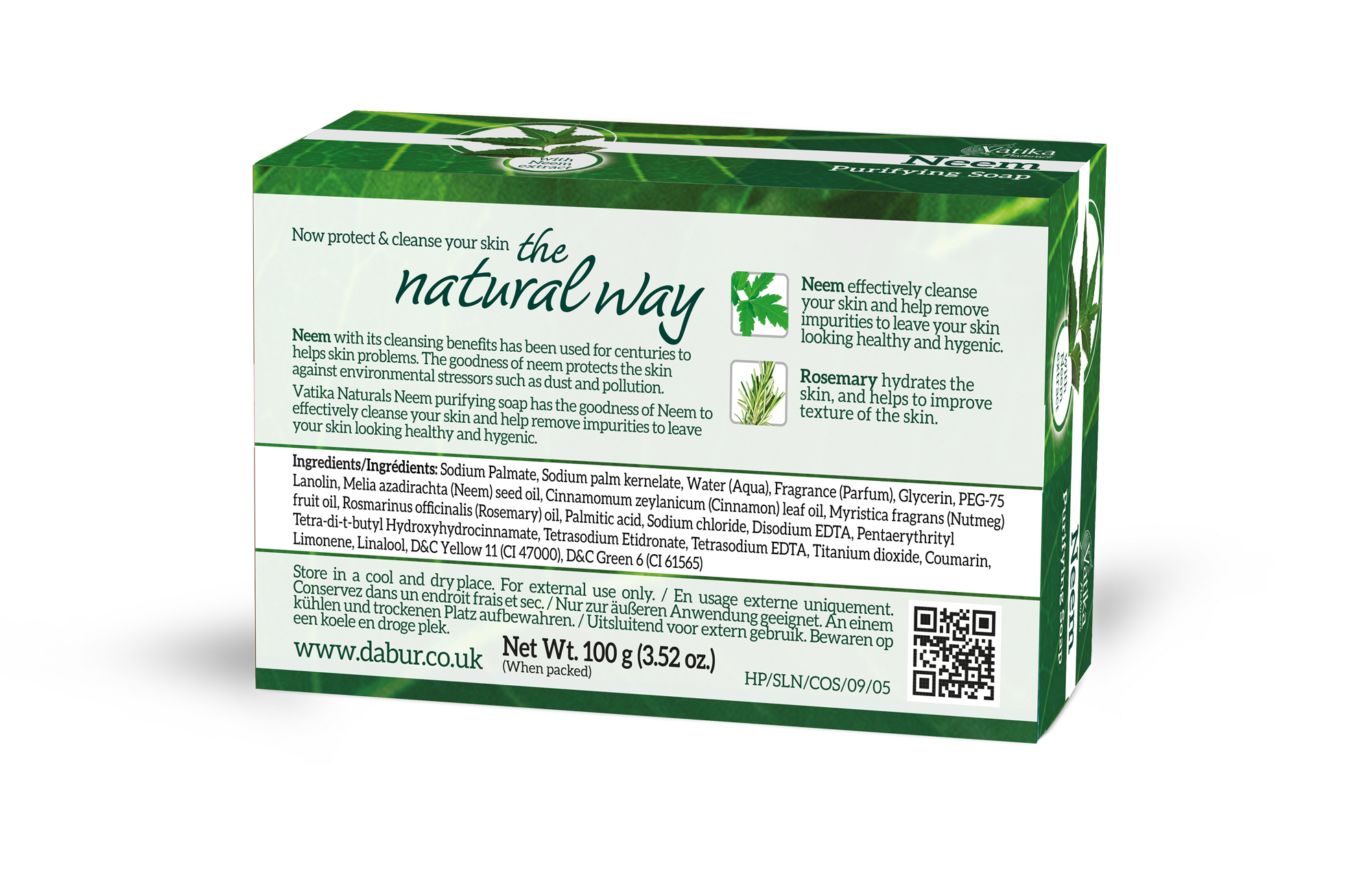 Sodium Palmate, Sodium palm kernelate, Water (Aqua), Fragrance (Parfum), Glycerin, PEG-75 Lanolin, Melia azadirachta (Neem) seed oil, Cinnamomum zeylanicum (Cinnamon) leaf oil, Myristica fragrans (Nutmeg) fruit oil, Rosmarinus officinalis (Rosemary) oil, Palmitic acid, Sodium chloride, Disodium EDTA, Pentaerythrityl Tetra-di-t-butyl Hydroxyhydrocinnamate, Tetrasodium Etidronate, Tetrasodium EDTA, Titanium dioxide, Coumarin, Limonene, Linalool, D&C Yellow 11 (CI 47000), D&C Green 6